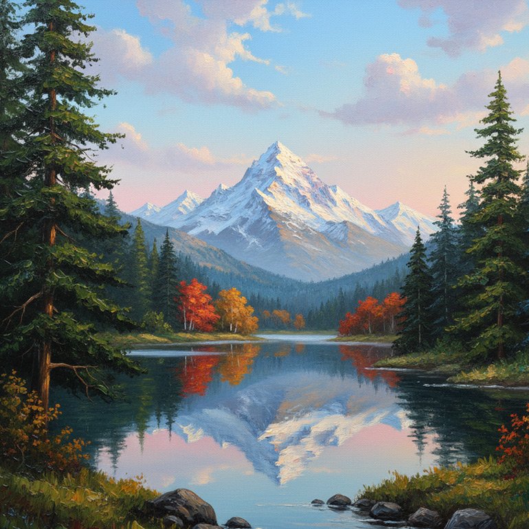 Create your own “Happy Little Accidents”! This master template instantly generates tranquil, Bob Ross-style oil paintings that feel authentically handmade. Just pick your mountain, water, and tree types to get a gorgeous landscape..